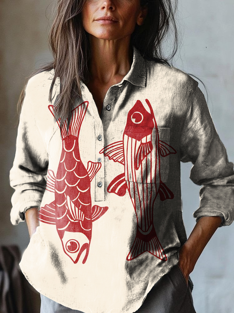 Women's Sardines Art Print Casual Cotton and Linen Shirt