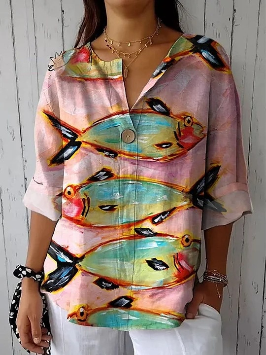 Women's Vintage Fish Art Print Casual Cotton Linen Shirt