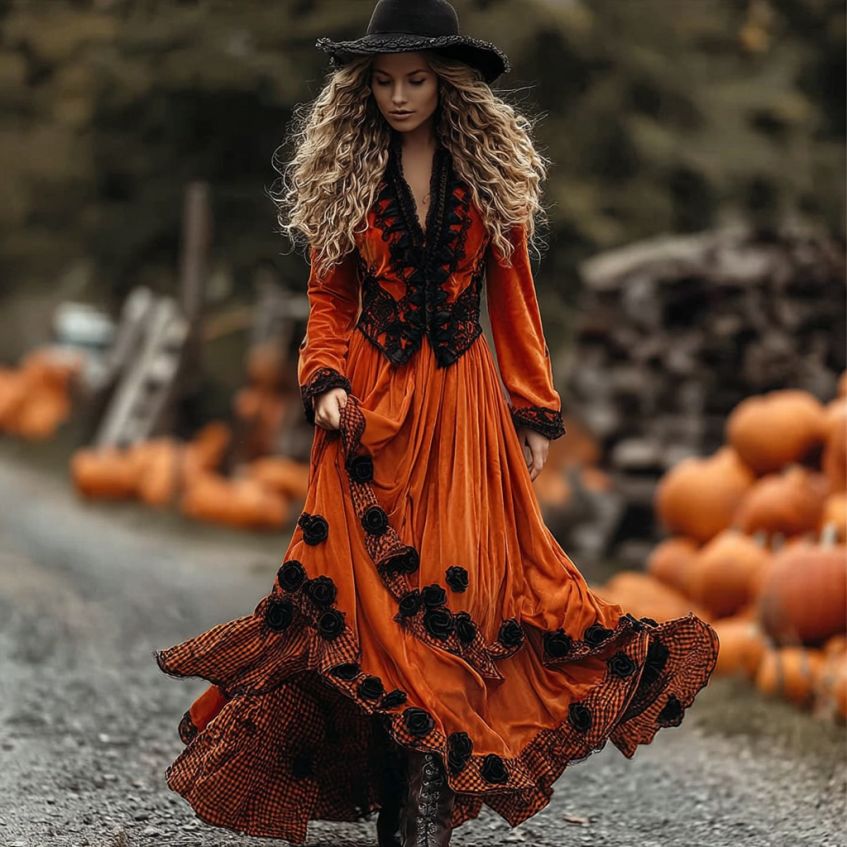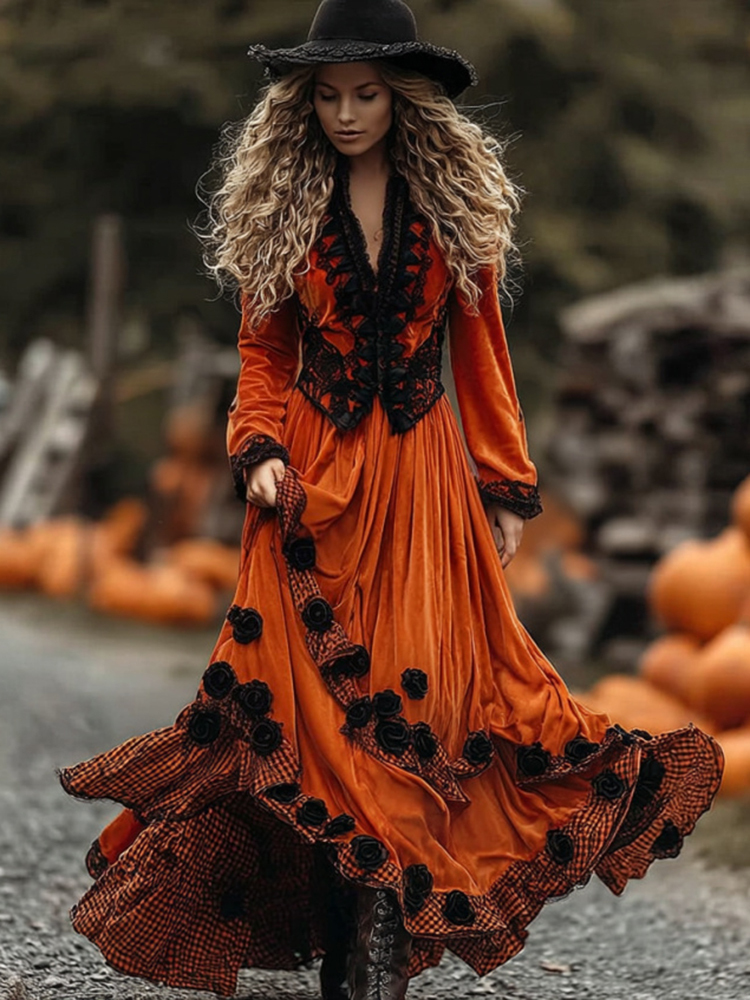 Women's Vintage Halloween Black Roses And Orange Plaid Art Comfy Velvet Maxi Dress