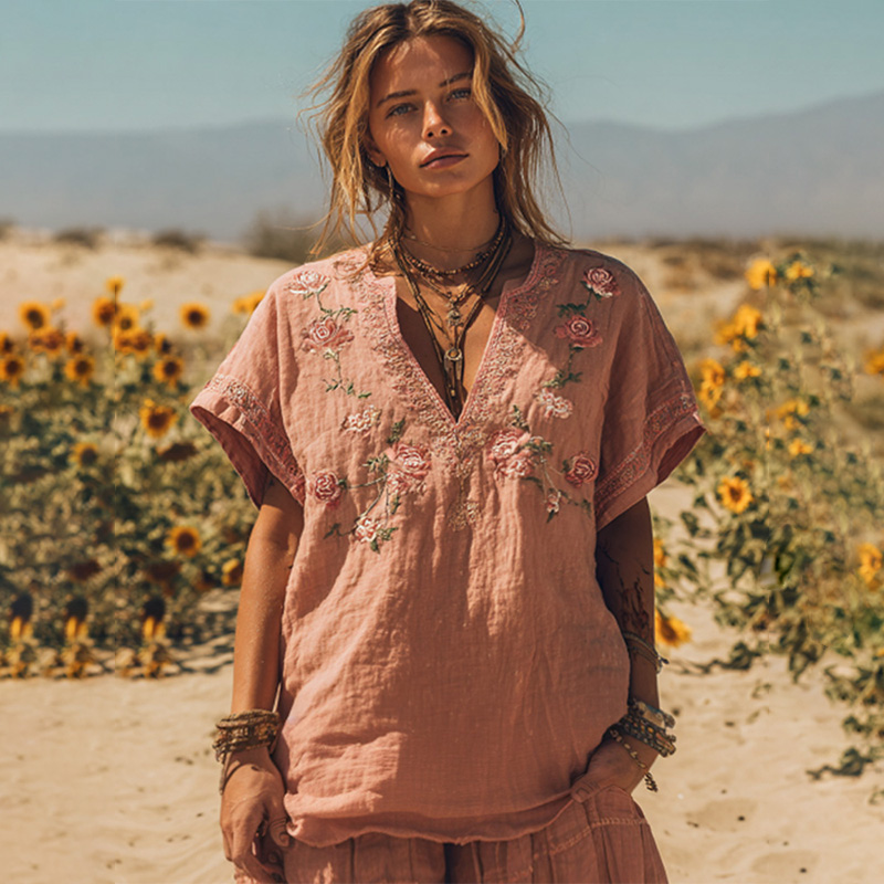 Women's Vintage Pink Floral Art Embroidery Linen T-shirt