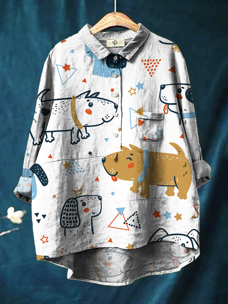 Cartoon Cute Lines Puppy Sun Rainbow Print Cotton And Linen Shirt