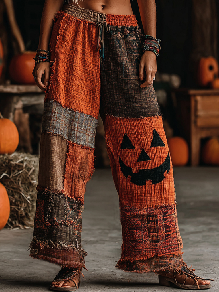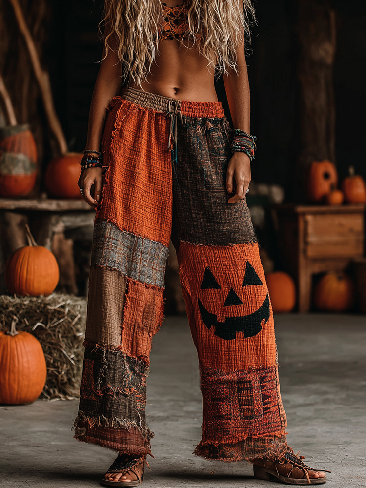 Classic Halloween Pumpkin Face Contrast Color Patchwork Linen Pants