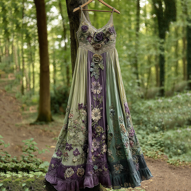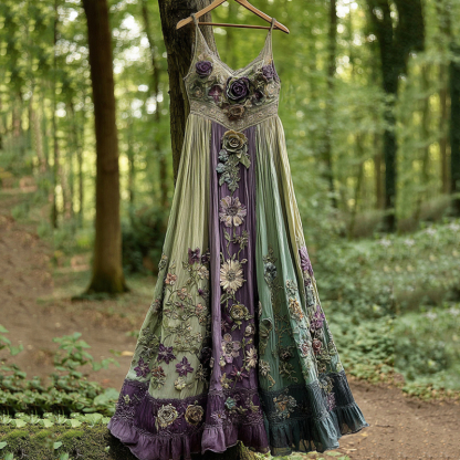 Classy Gradient Purple Lavender And Floral Embroidered Linen Suspender Long Dress