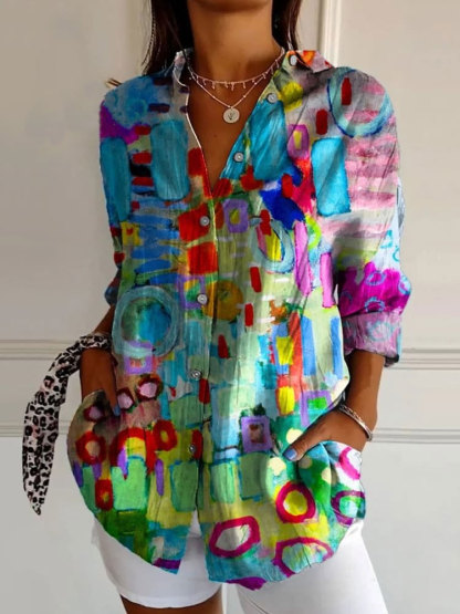 Colorful Abstract Painting Printed Women's Casual Cotton Shirt