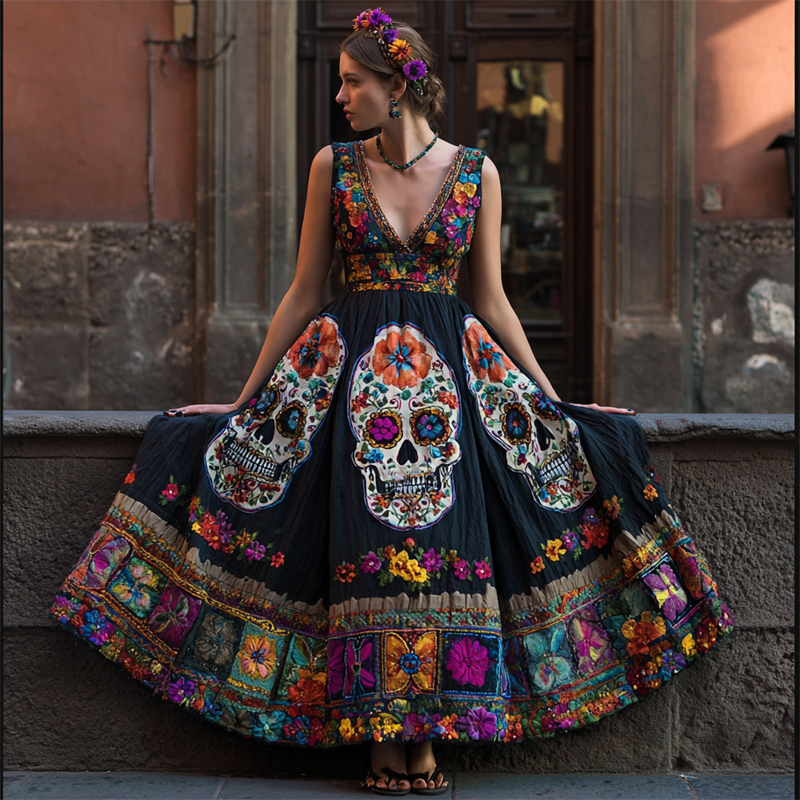 Day Of The Dead Sugar Skulls Mexican Floral Embroidered Linen Maxi Dress