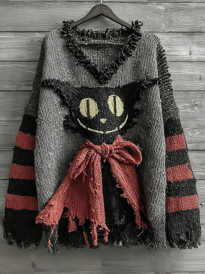 Halloween Caped Black Cat Striped Knitted Cozy V-neck Sweater