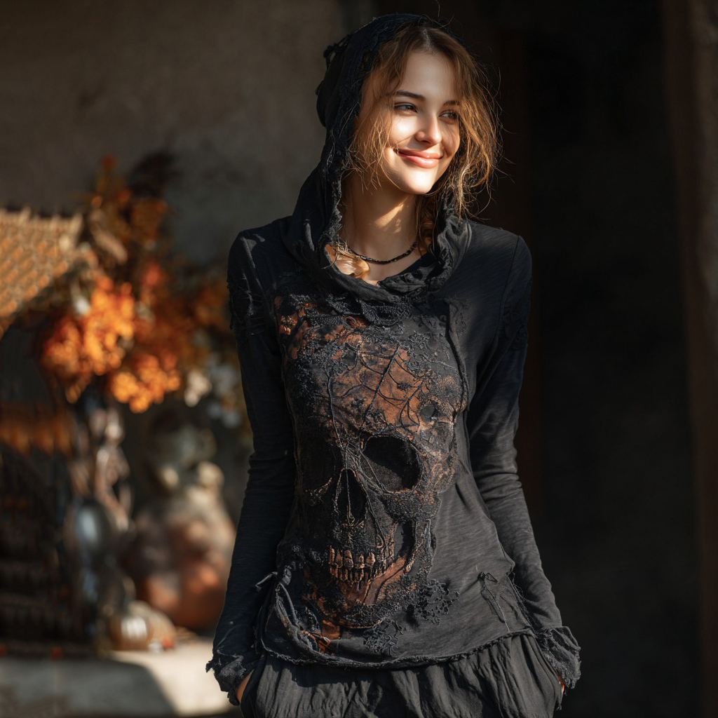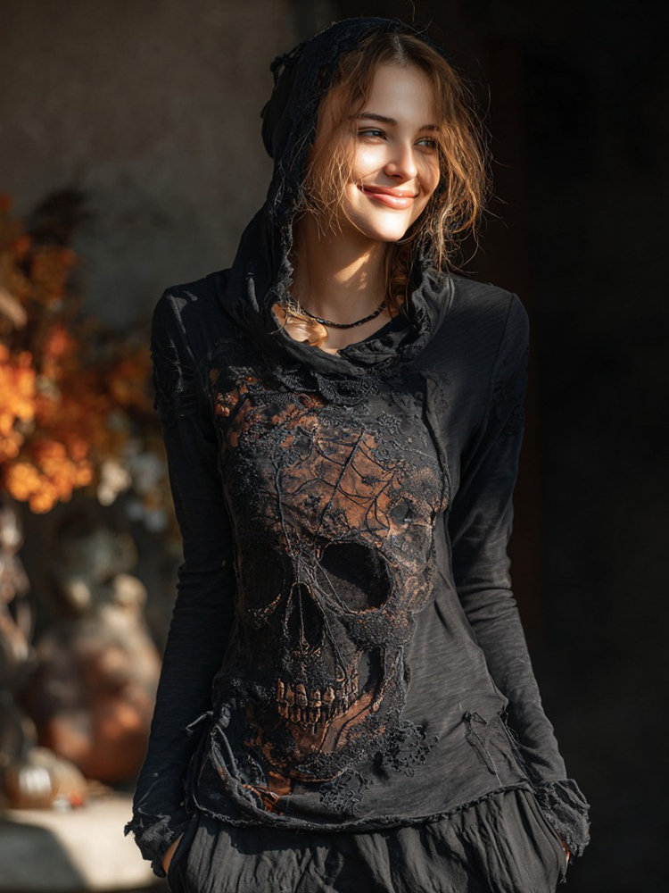 Halloween Dark Skull And Spider Web Pattern Women's Hooded T-shirt