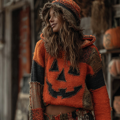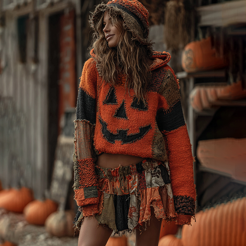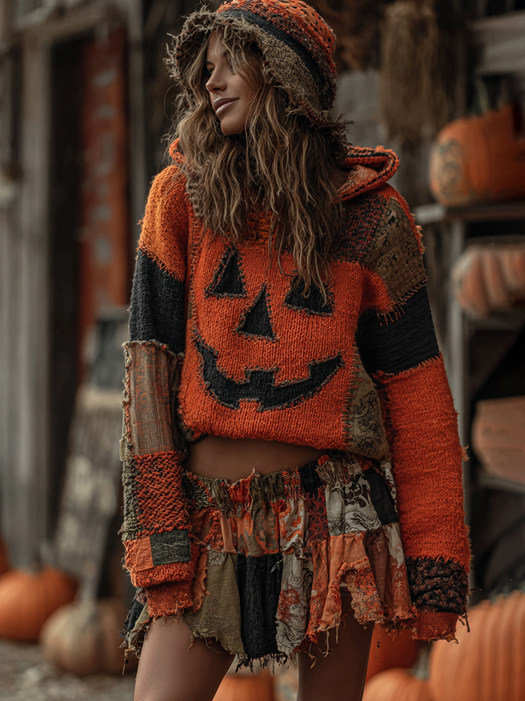 Halloween Pumpkin Face Art Cozy Knit Hooded Sweater