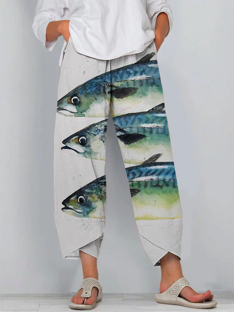 Japanese Fish Art Print Cropped Pants