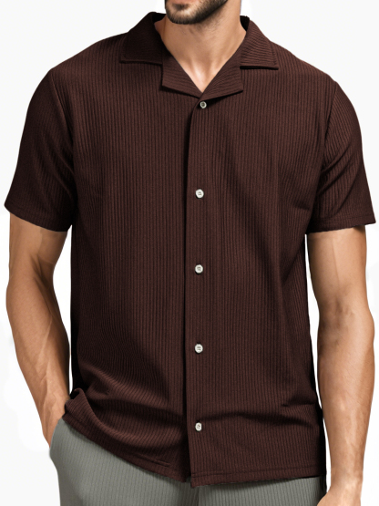 Men's Pit Stripe Pleated Cuban Collar Holiday Casual Button Short Sleeve Shirt