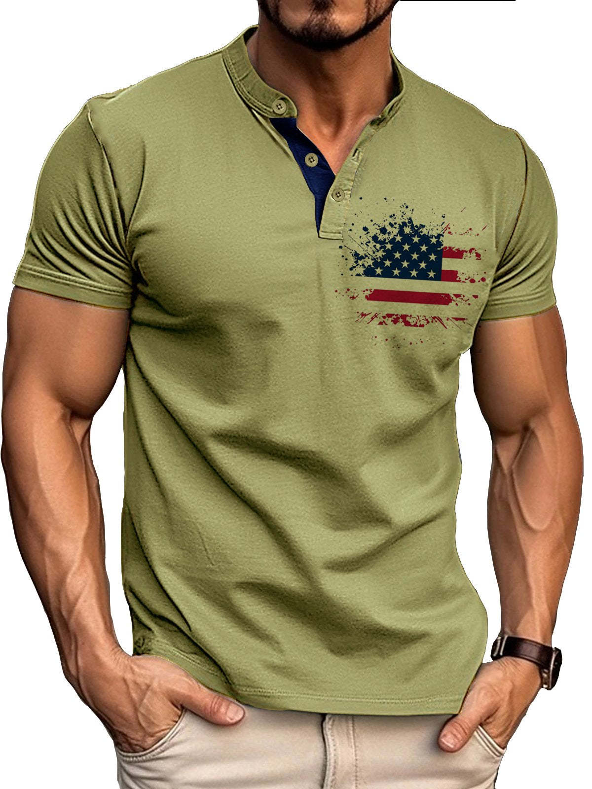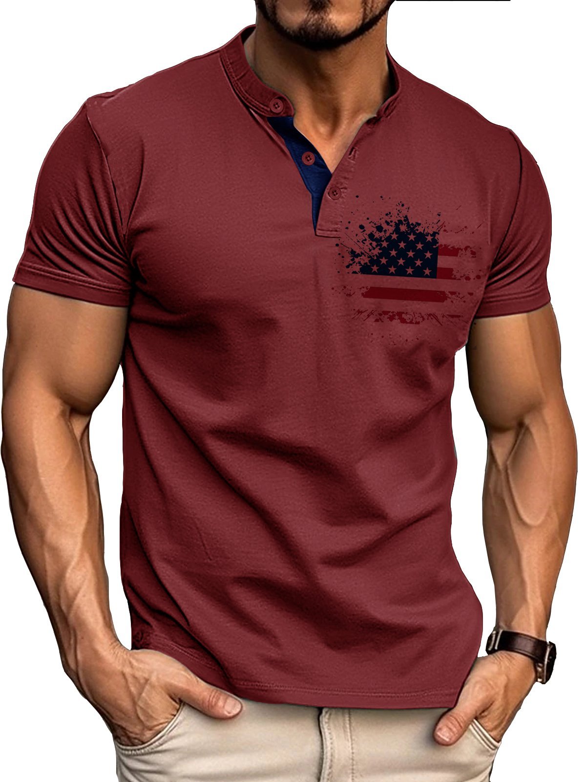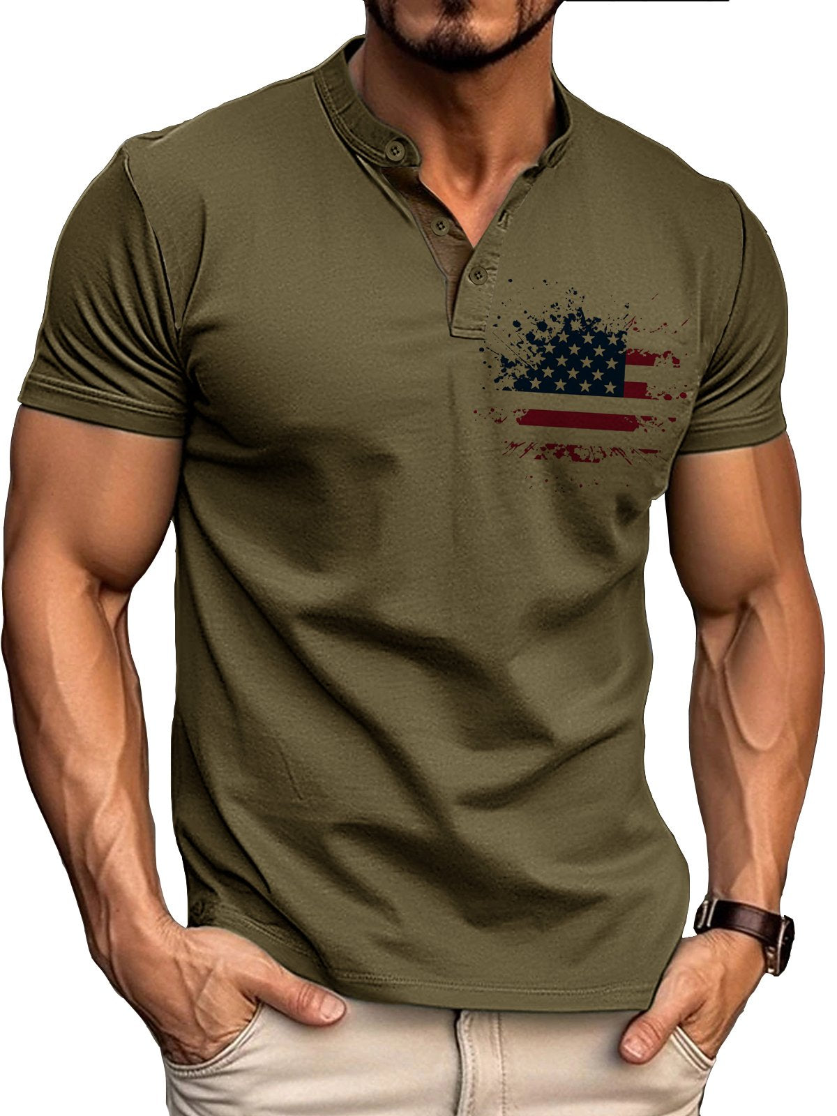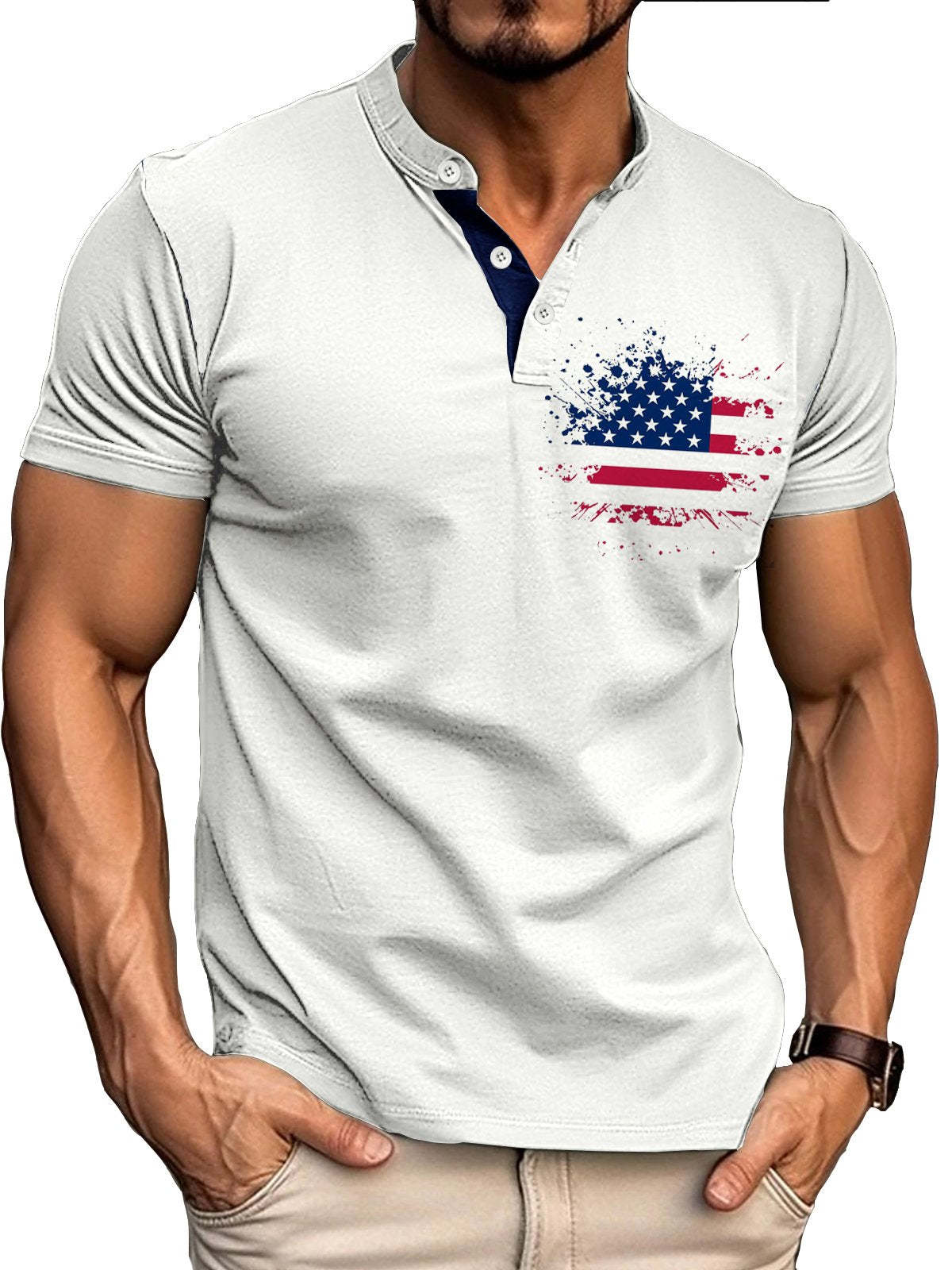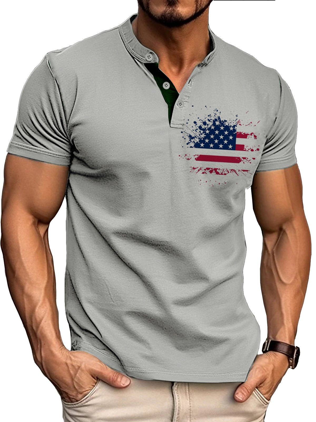 Men's Retro Basic Patchwork Flag Print Short-sleeved Henley Shirt