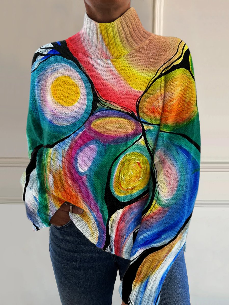 Retro Color Block Circle Art Print Knit Turtleneck Pullover Sweater