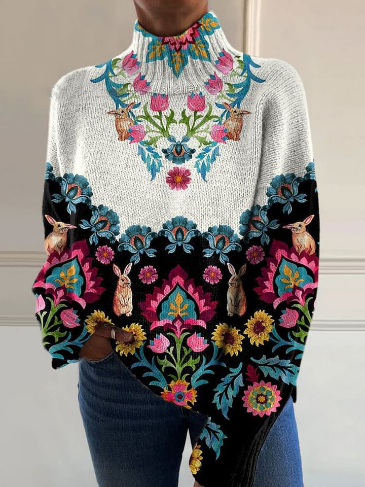 Retro Pattern Print Knit Turtleneck Pullover Sweater