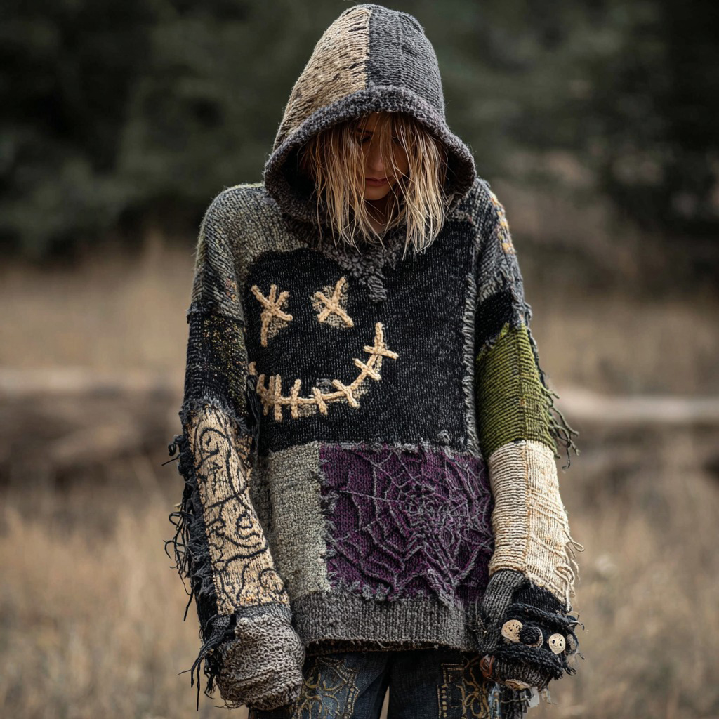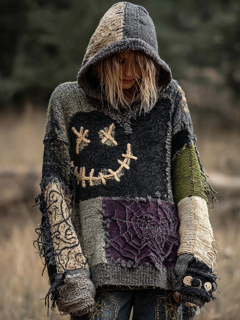 Spooky Face And Spider Web Patchwork Design Cozy Halloween Knit Hooded