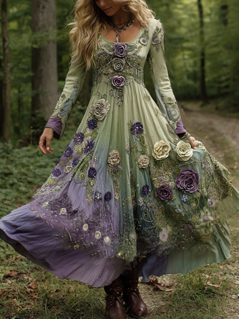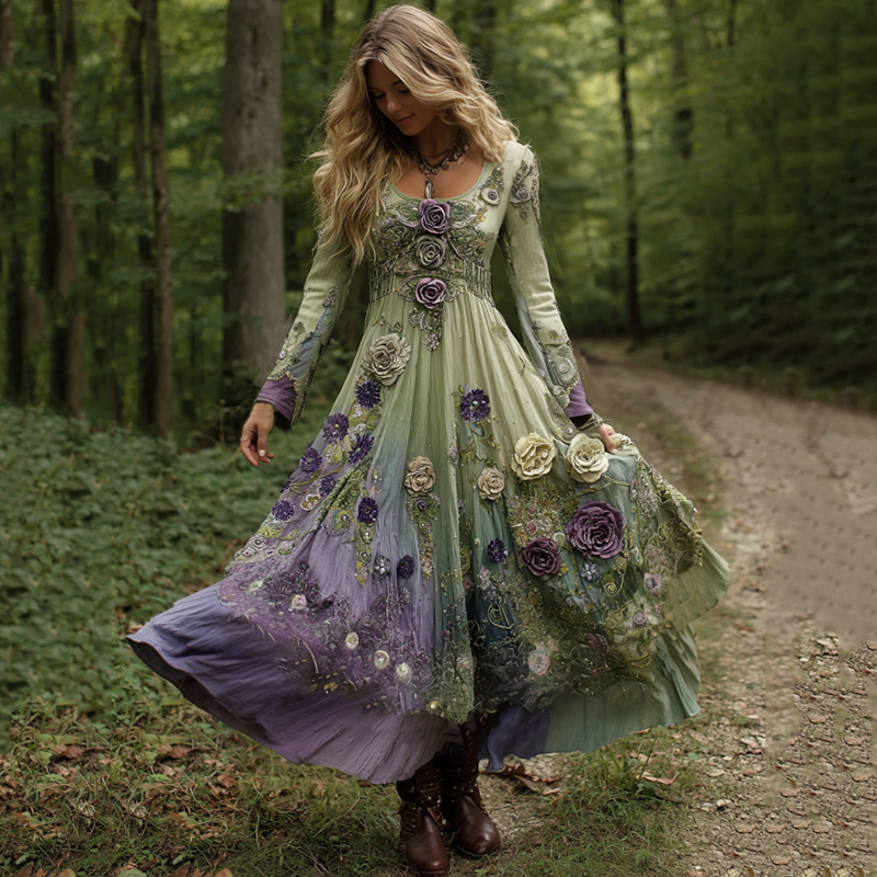 Vintage Classy Gradient Purple Lavender And Floral Embroidered Linen Maxi Dress