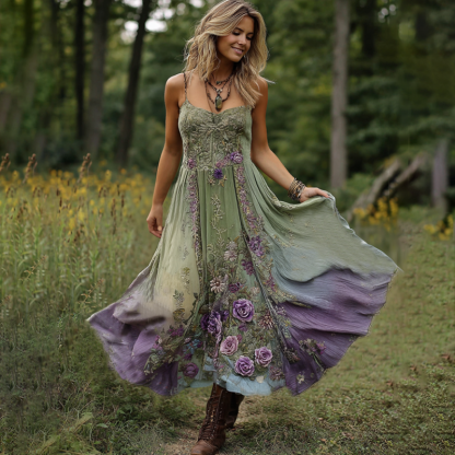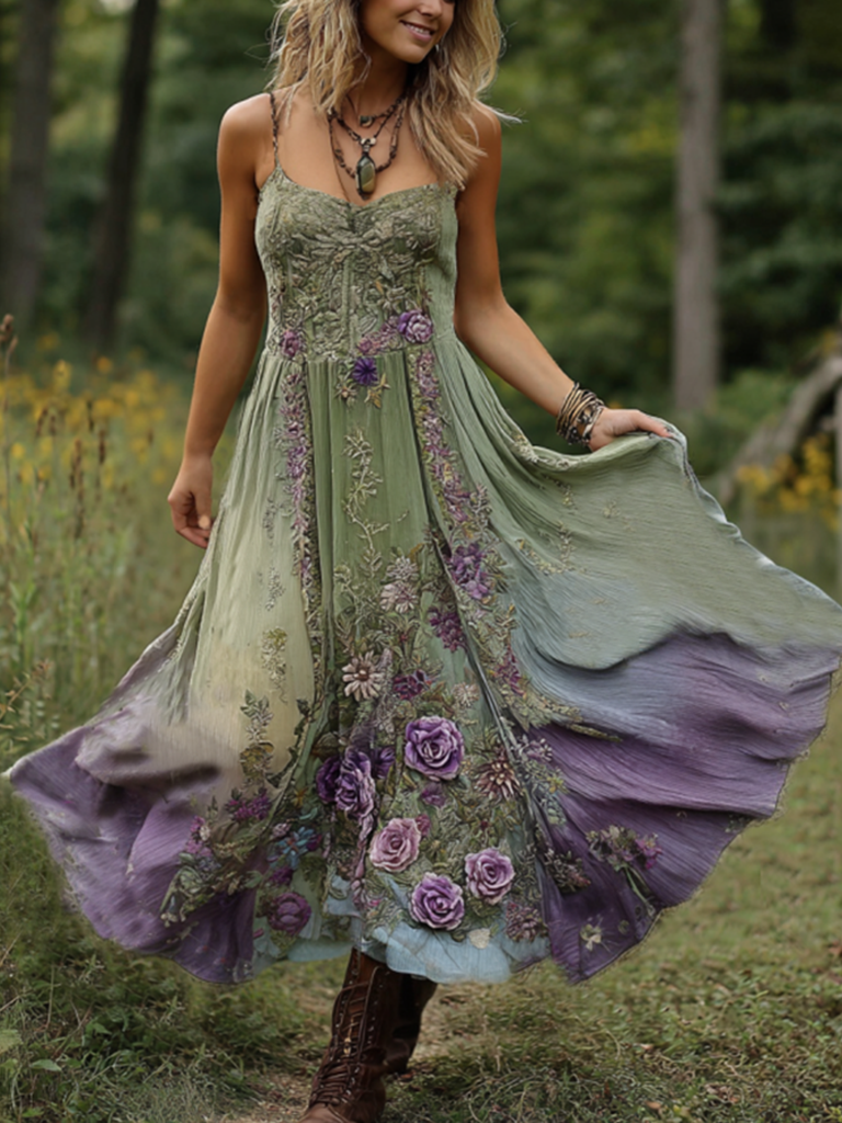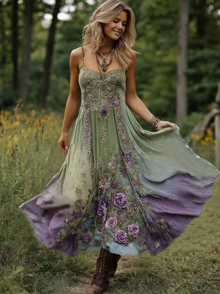 Vintage Classy Gradient Purple Lavender And Floral Embroidered Linen Suspender Long Dress