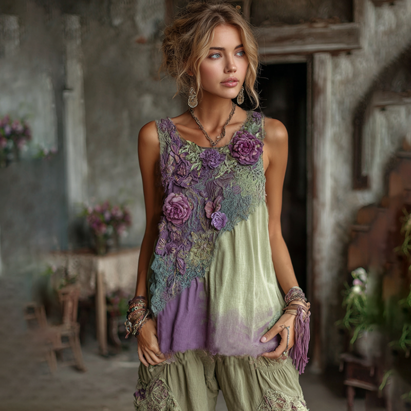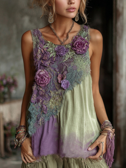 Vintage Classy Gradient Purple Lavender And Floral Embroidered Pattern Linen Tank Top