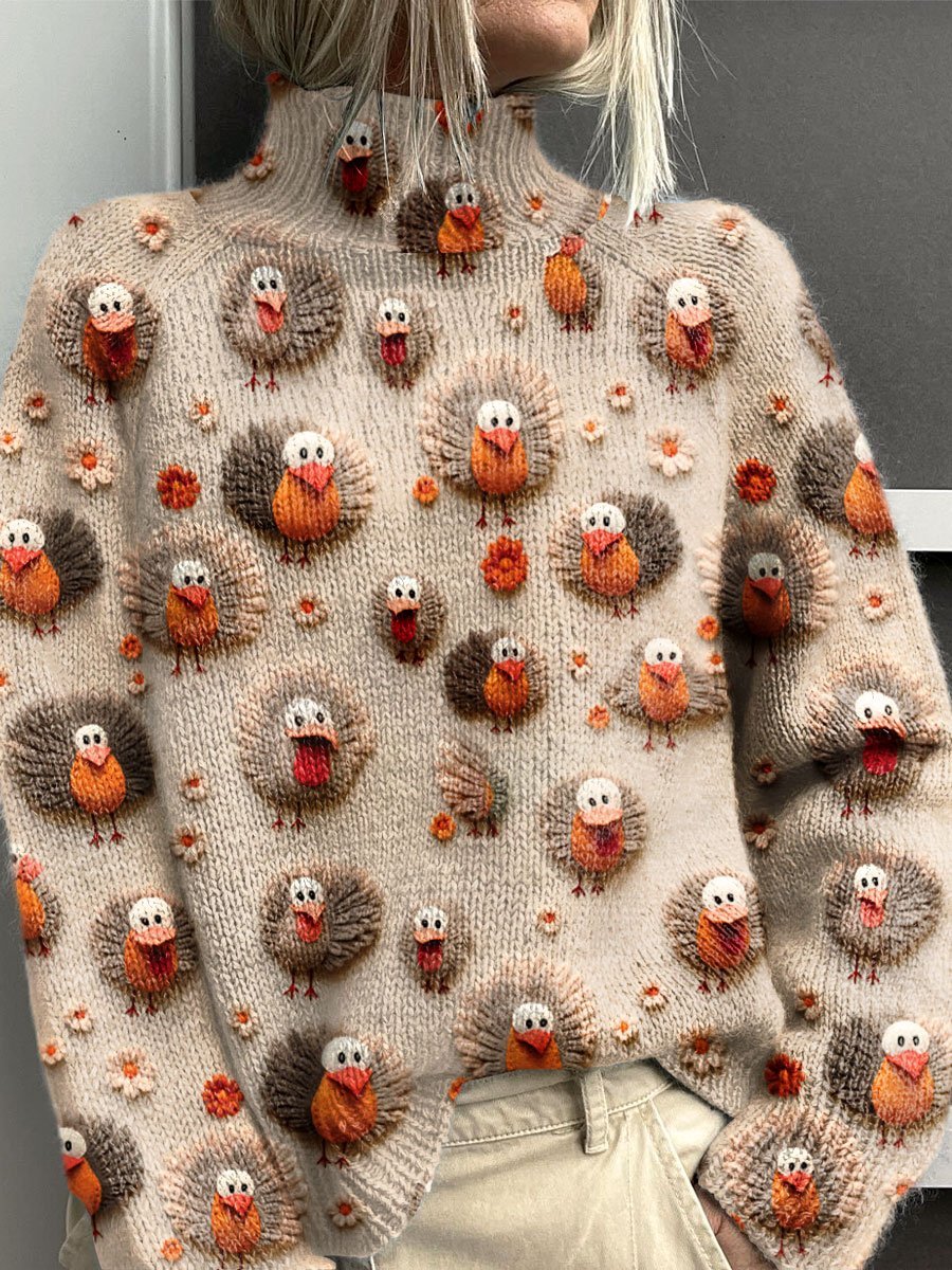 Vintage Cute Little Turkeys Fall Thanksgiving Print Knit Turtleneck Pullover Sweater