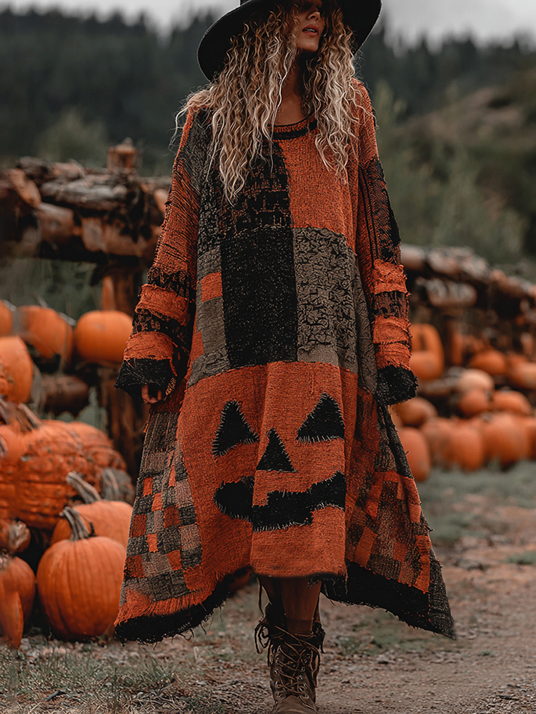 Vintage Halloween Pumpkin Face Patchwork Art Linen Long Sleeve Maxi Dress