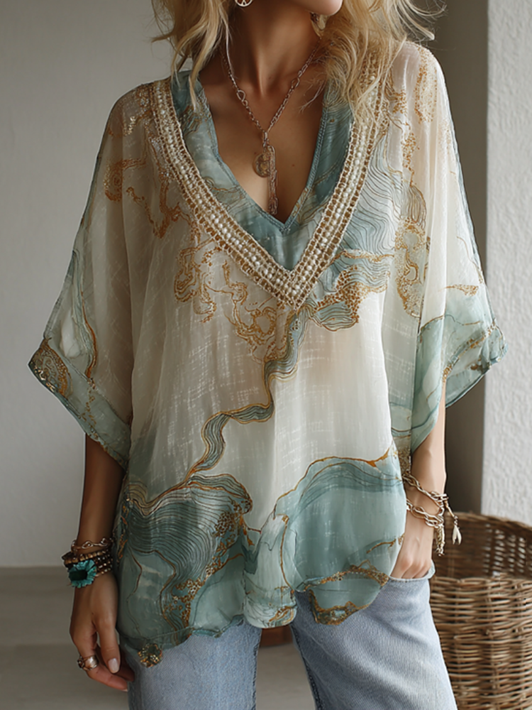 Vintage Marble Texture Collection Bohemia Women Style Gradient Gilded Pattern Linen V Neck T-shirt