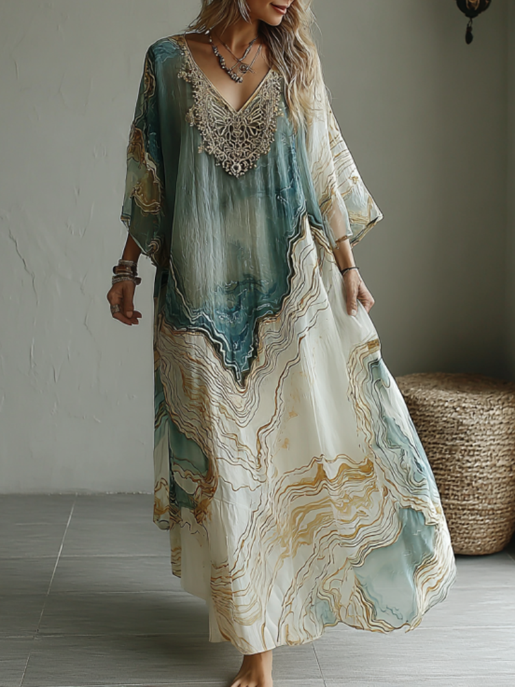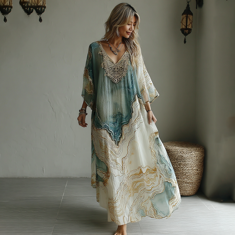 Vintage Marble Texture Collection Retro Bohemia Women Style Gradient Gilded Pattern Linen Maxi Dress