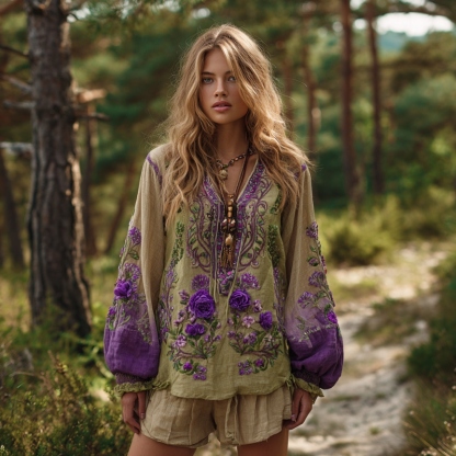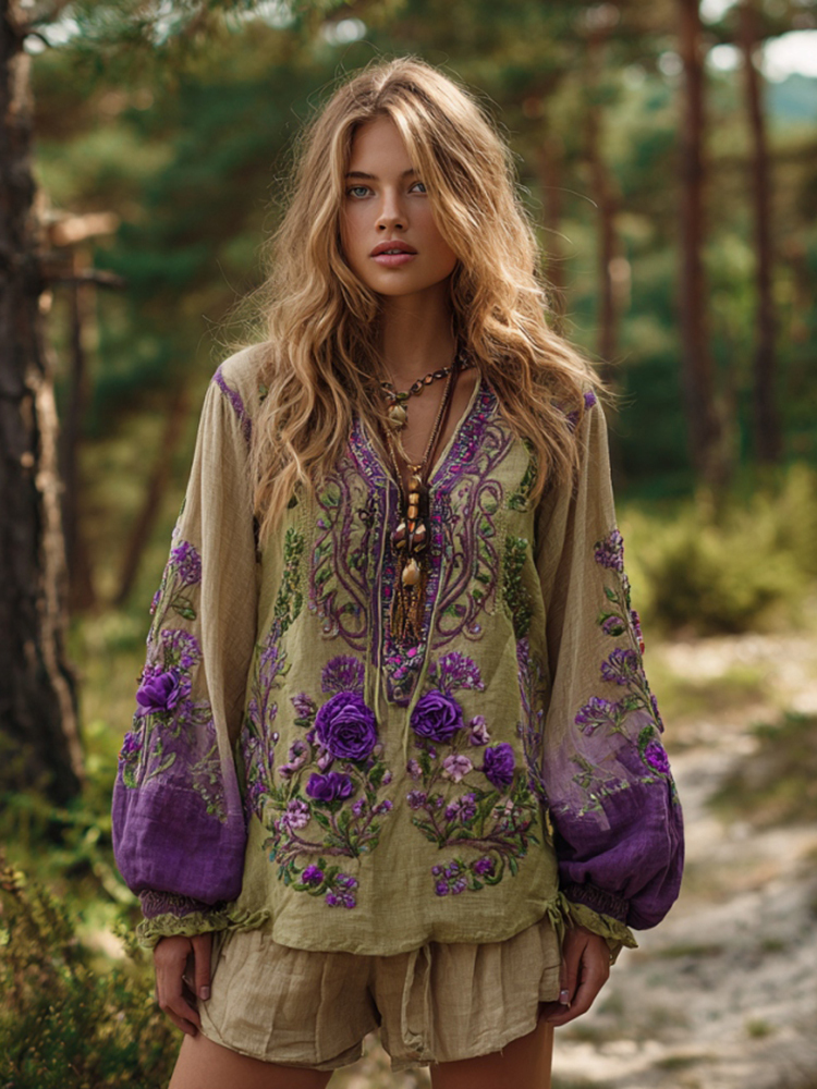 Vintage Purple Floral Embroidery Linen V Neck Long Sleeve Shirt