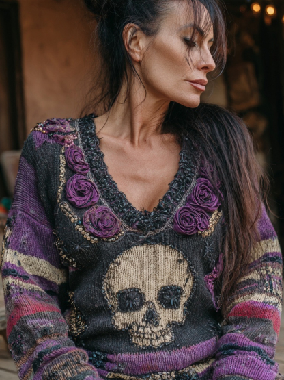 Vintage Skull & Roses Embroidered Cozy Knit Sweater