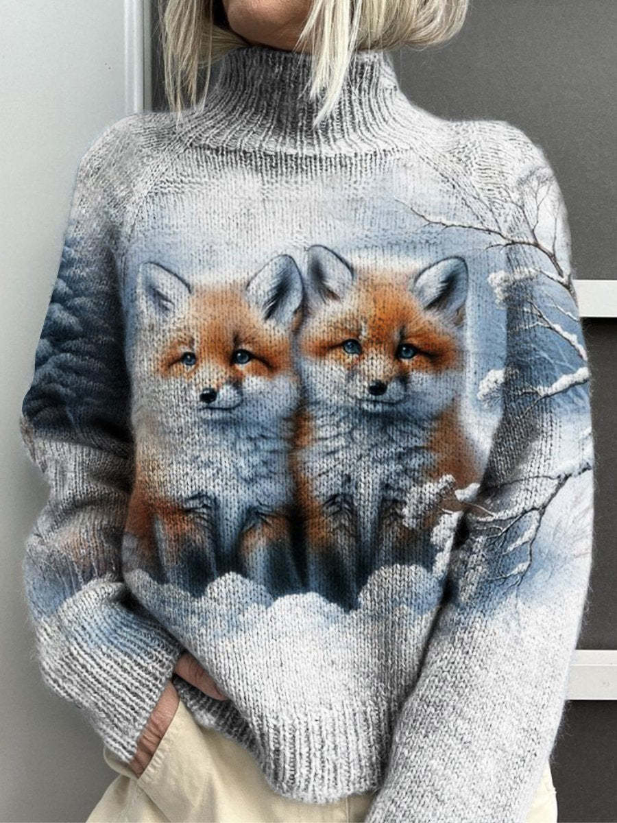 Winter Fox Print Knitted Turtleneck Pullover Sweater