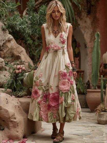Women Vintage Floral Embroidery Art V Neck Linen Maxi Dress