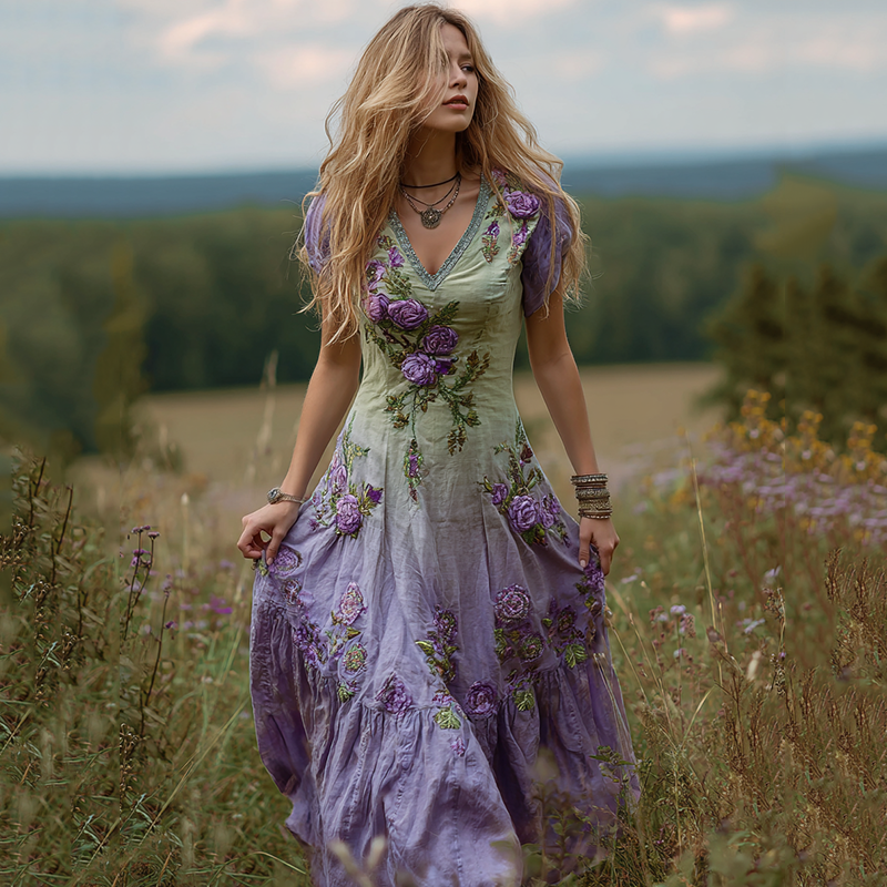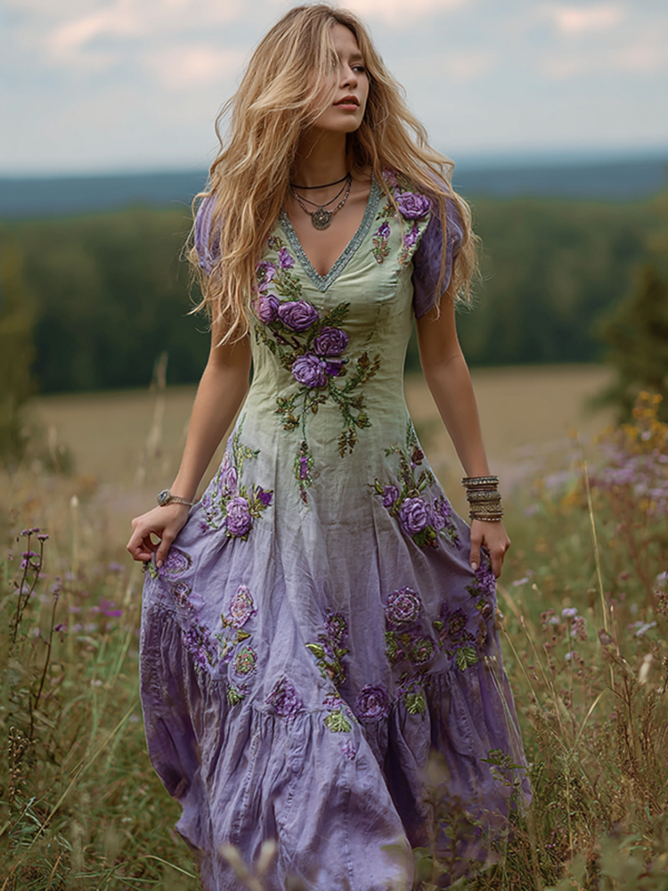 Women's Bohemian Floral Art Gradient Linen Maxi Dress