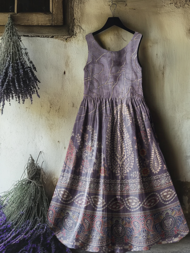 Women's Boho Floral Art Print Crew Neck Sleeveless Cotton Pocket Dress