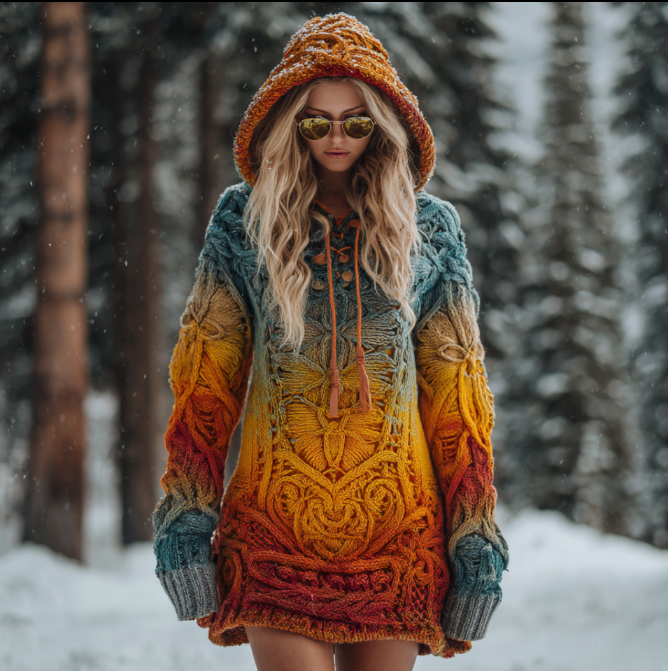 Women's Gradient Color Hooded Long Sweater With Viking Style Tribal Totem