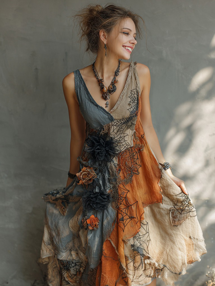 Women's Halloween Floral And Spider Web Sleeveless Dress