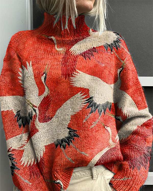 Women's Japanese Crane Print Casual Knit Turtleneck Sweater
