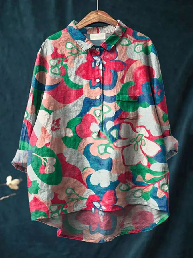 Women's Lapel Button Design Plant Floral Casual Long Sleeve Shirt