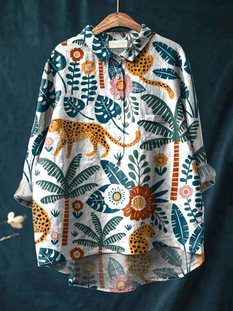Women's Leopard Flowers Leaves Art Print Casual Cotton And Linen Shirt