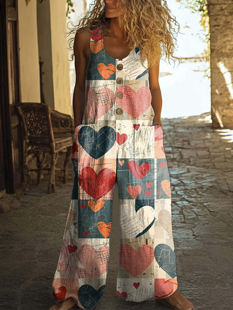Women's Love Plaid Art Print Casual Suspenders Wide Leg Pants