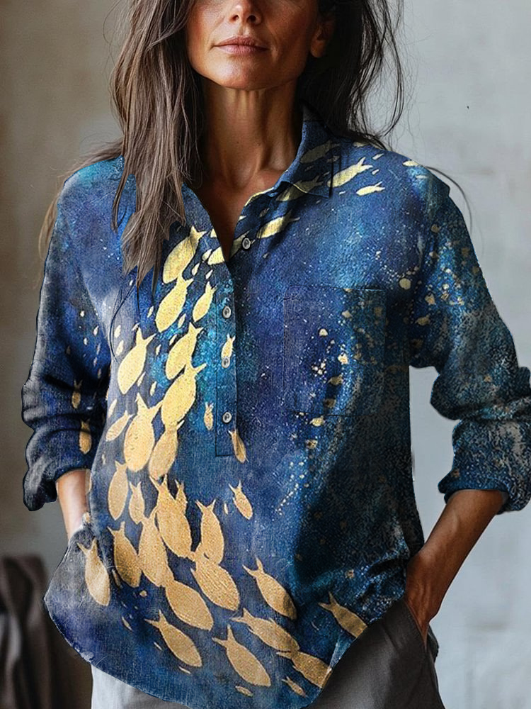 Women's Ocean Fish Art Print Casual Cotton and Linen Shirt
