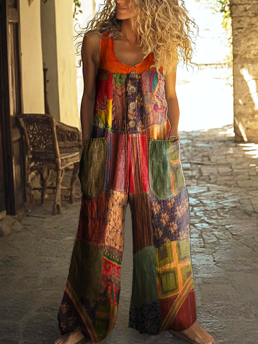 Women's Retro Floral Patchwork Art Print Casual 100% Cotton Wide Leg Jumpsuit