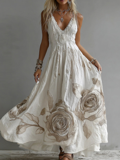 Women's Rose Embroidery Art V-neck Suspender Maxi Dress