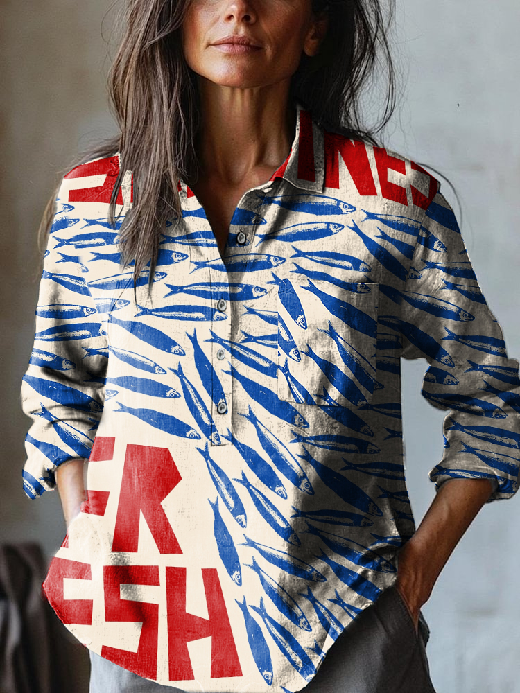 Women's Sardines Art Print Casual Cotton and Linen Shirt