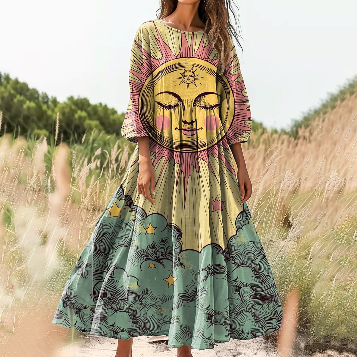 Women's Sun Clouds Pattern Art Print Cotton Crew Neck Dress