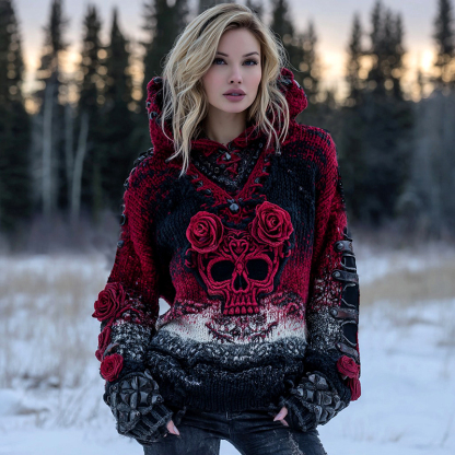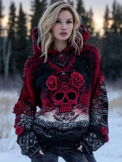 Women's Viking Gothic Rose And Skull Inspired Knit Hooded Sweater