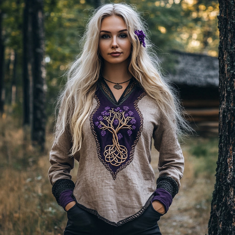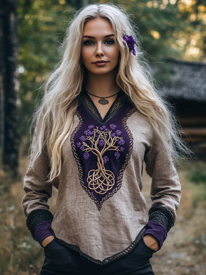 Women's Viking Purple Blossom Tree Of Life Patchwork Linen Shirt