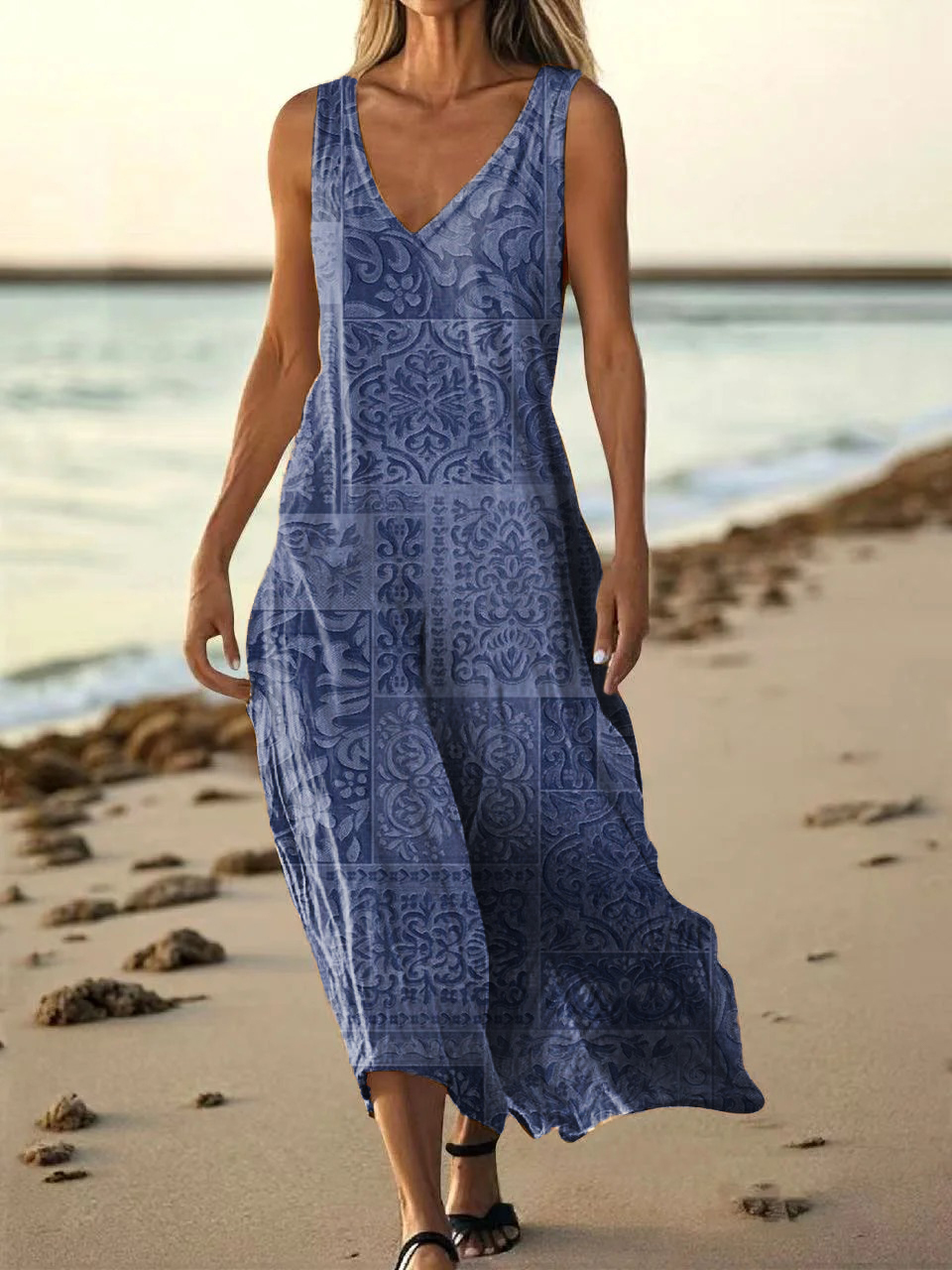 Women's Vintage Ethnic Floral Art Print Pocket Cotton Dress