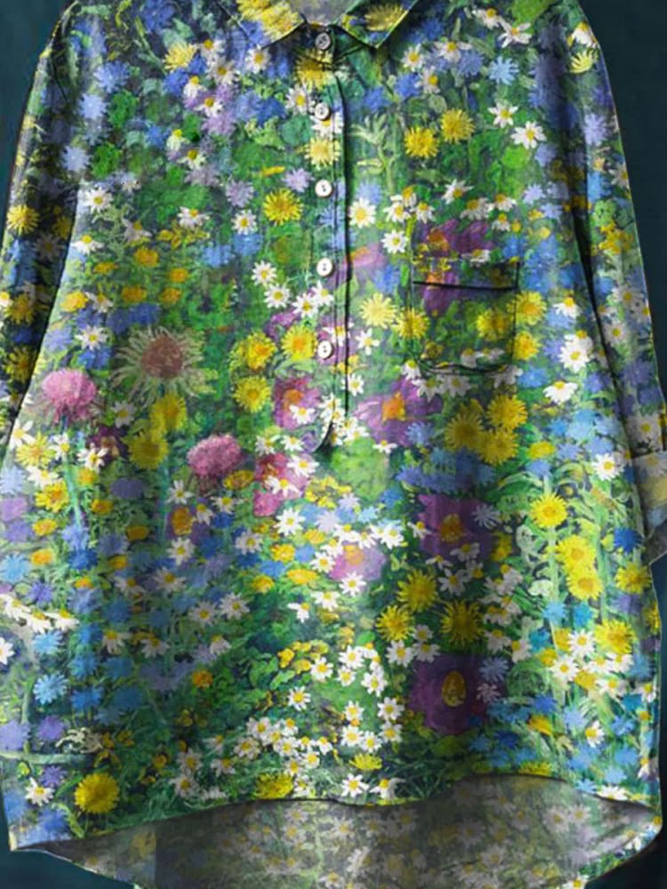 Women's Vintage Floral Art Print Casual Cotton And Linen Shirt