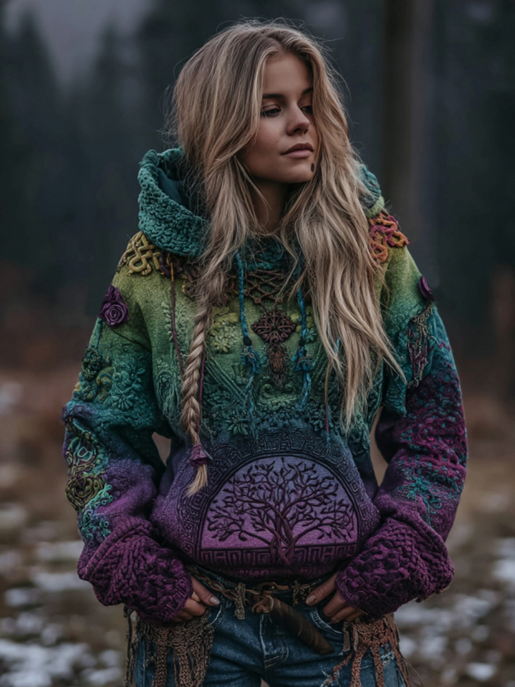 Women's Vintage Life Of Tree Gradient Art Knit Hooded Sweater