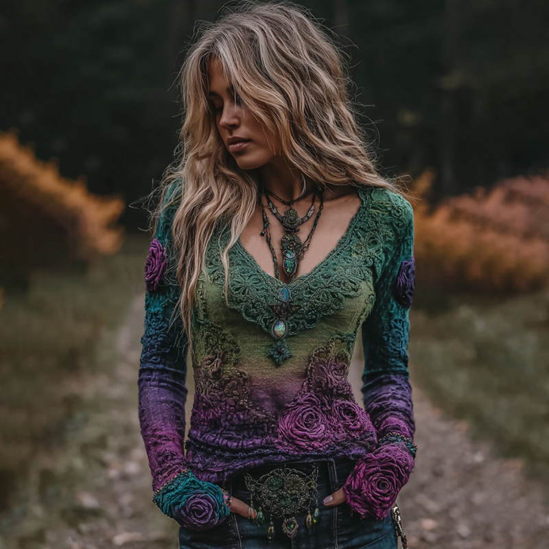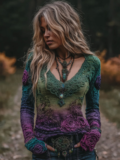 Women's Vintage Rose Gradient Lace Art V Neck T-shirt
