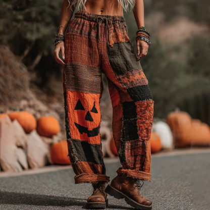 Bohemian Halloween Pumpkin Face Contrast Color Patchwork Linen Pants