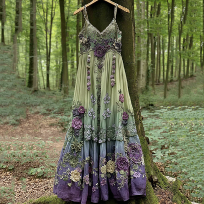 Classy Gradient Purple Lavender And Floral Embroidered Linen Suspender Long Dress